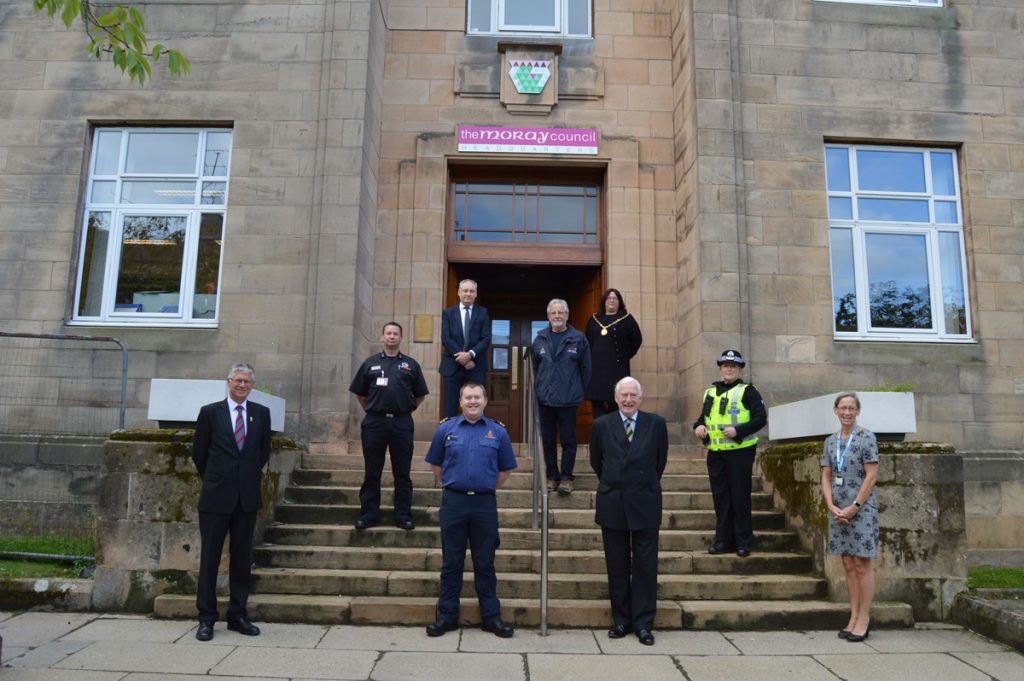 The Lords-Lieutenant of Moray and Banffshire, Major General Seymour Monro and Andrew Simpson respectively, were joined by Moray Council Convener, Shona Morrison, and Chief Executive, Roddy Burns alongside Richard Lochhead MSP. Also in attendance were representatives from the Armed Forces and emergency services in Moray including Police Scotland, HM Coastguard, RAF Mountain Rescue, Scottish Fire and Rescue Service, NHS Scotland and MIRO (Moray Inshore Rescue Organisation).